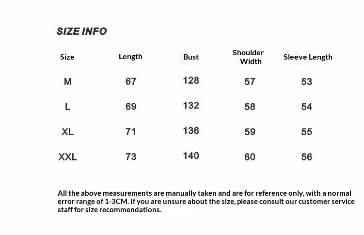 Note: 1. Asian sizes are 1 to 2 sizes smaller than European and American people. Choose the larger size if your size between two sizes. Please allow 2-3cm differences due to manual measurement. 2. Please check the size chart carefully before you buy the item, if you don't know how to choose size, please contact our customer service. 3.As you know, the different computers display colors differently, the color of the actual item may vary slightly from the following images.